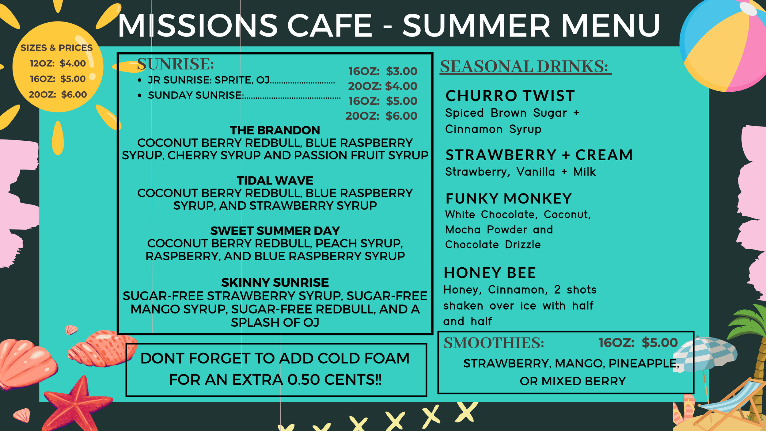 OUR MISSIONS CAFE IS OPEN SUNDAYS FROM 9:30AM-10:45AM.