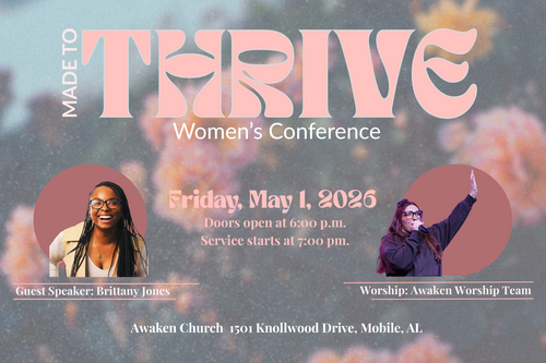 Join us ladies for a special Thrive Conference 2026! We are so excited for all the God has in store. Doors open at 6 and service starts at 7. Tickets are $20. Each person will get a free gift and there will be vendors, merch, dessert bar, and more. Our guest speaker is Brittany jones with worship from Awaken Worship team.